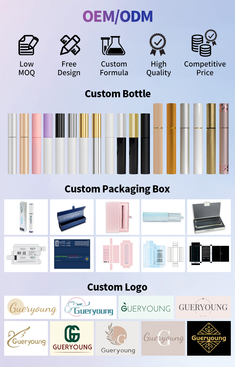 This Eyelash Growth Serum features a slim precision brush applicator designed for accurate application along the lash line. The lightweight liquid texture allows easy daily use while helping enhance the appearance of fuller lashes. Developed by GUER YOUNG, this Lash Enhancer Serum is ideal for OEM, private label, and wholesale beauty brands expanding their lash care product lines.