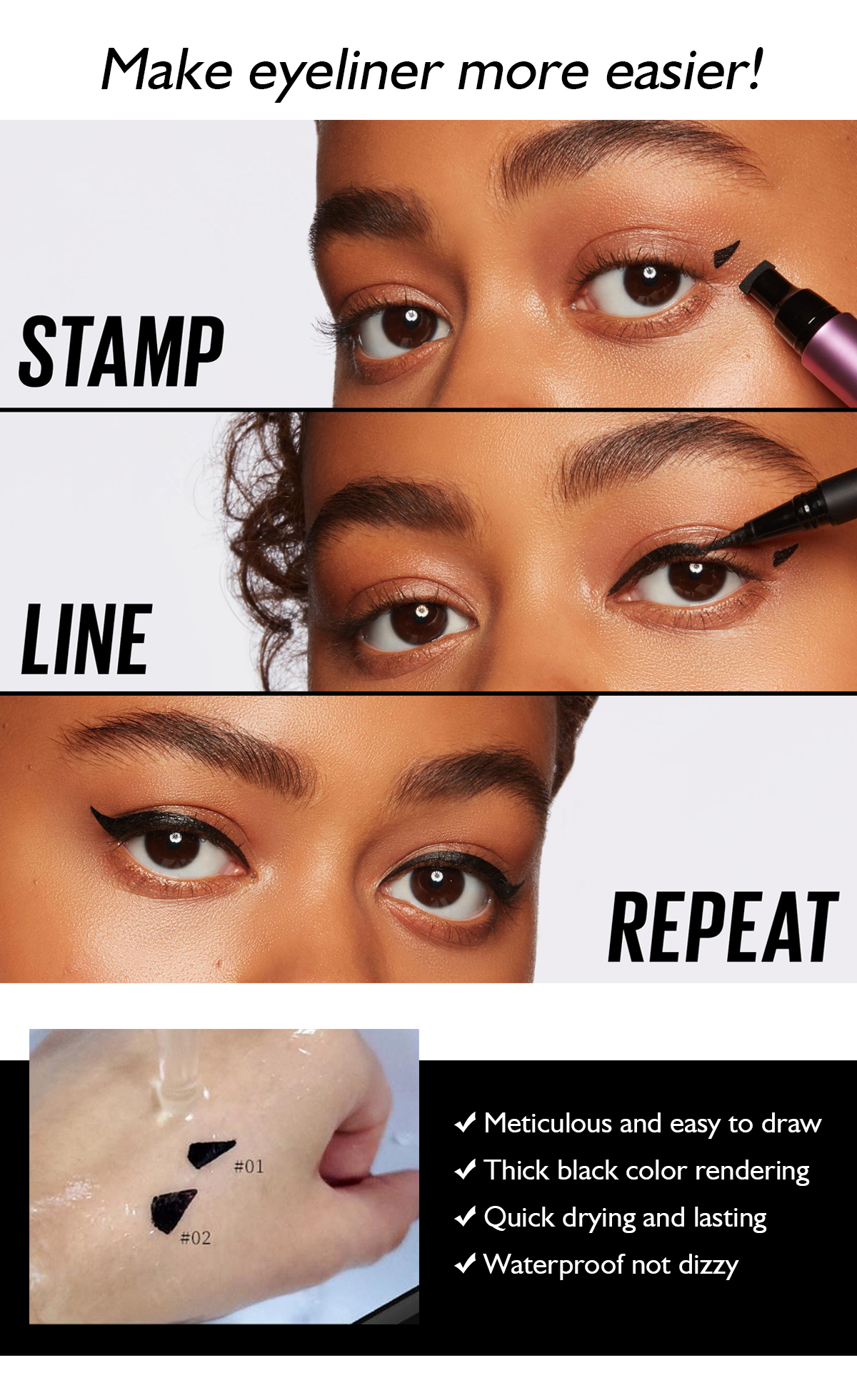 This double-ended eyeliner stamp pen features a precise fine tip for flawless lining and a creative stamp for playful accents like stars, moons, hearts, and flowers. Achieve a sharp wing or decorative look effortlessly. Smudge-proof, waterproof, and perfect for all-day wear.
